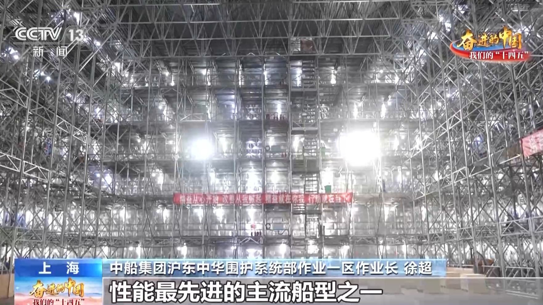 中船集团沪东中华安全壳一区作业区长 徐超:我们现在在一艘17.4万立方米LNG船的货舱内。该船是世界市场上最先进的船型之一。它的长度约为50米,宽度为40米,高度为30米,相当于一座10层的工厂。