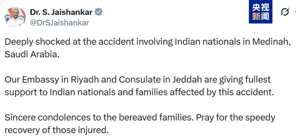 据通讯社记者获悉,当地时间17日,一辆载有印度朝圣者的巴士与一辆从麦加开往沙特阿拉伯麦地那的油罐车相撞,造成至少42人死亡。 △印度外交部长苏杰生就此次事故发表声明。印度外交部长苏杰生和印度驻吉达总领事馆证实了这起事故,但没有提供具体的伤亡数字。苏杰生在一份声明中表示,他对麦地那发生的涉及一名印度公民的事故深感震惊,并表示印度驻利雅得大使馆和印度驻吉达总领事馆正在向受影响的印度公民及其家人提供一切支持。 (总台记者 张悦 张艳宁) 上一篇:孝感市“十四五”规划丨超3000亿日元,孝感市成 下一篇:没有了